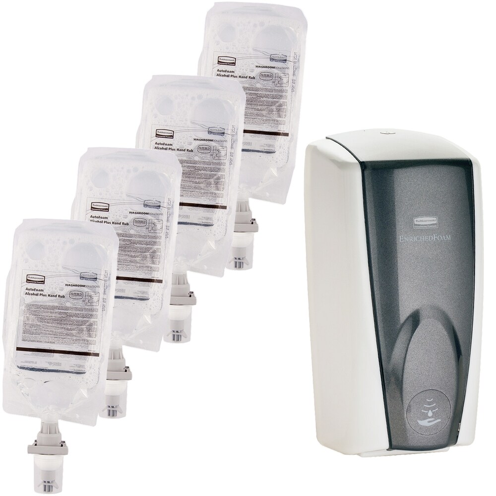 BRB Hände-Desinfektionsstation 5-teilig, berührungsloser Seifenspender, weiß + 4x Händedesinfektion, Inhalt 1000 ml je Beutel