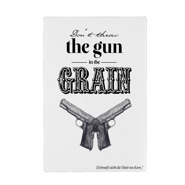 Metall Poster "Dont throw the Gun" artboxONE - Typografie,Schwarzweiß - Wildwesten,Gewehr,Cowboy,Denglish,übersetzung,Beschriftung,Ostholz