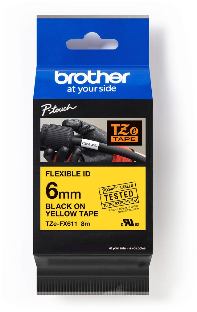 Brother TZe-FX611 Flexi-Tape laminiertes Schriftband für Beschriftungsgeräte, 6mm, 8m, schwarz/gelb