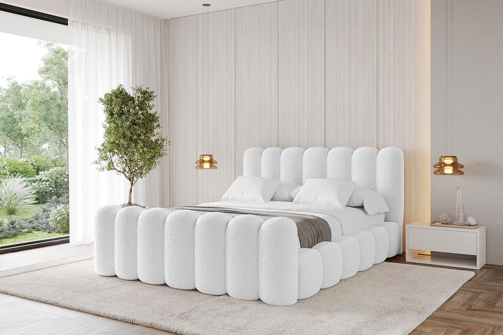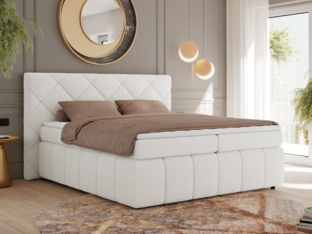 MKS MEBLE Boxspringbett 180x200 Weiß Boucle Matratze H4, Polsterbett 180x200, Bett 180x200, Boxspringbett 180x200 - Rita