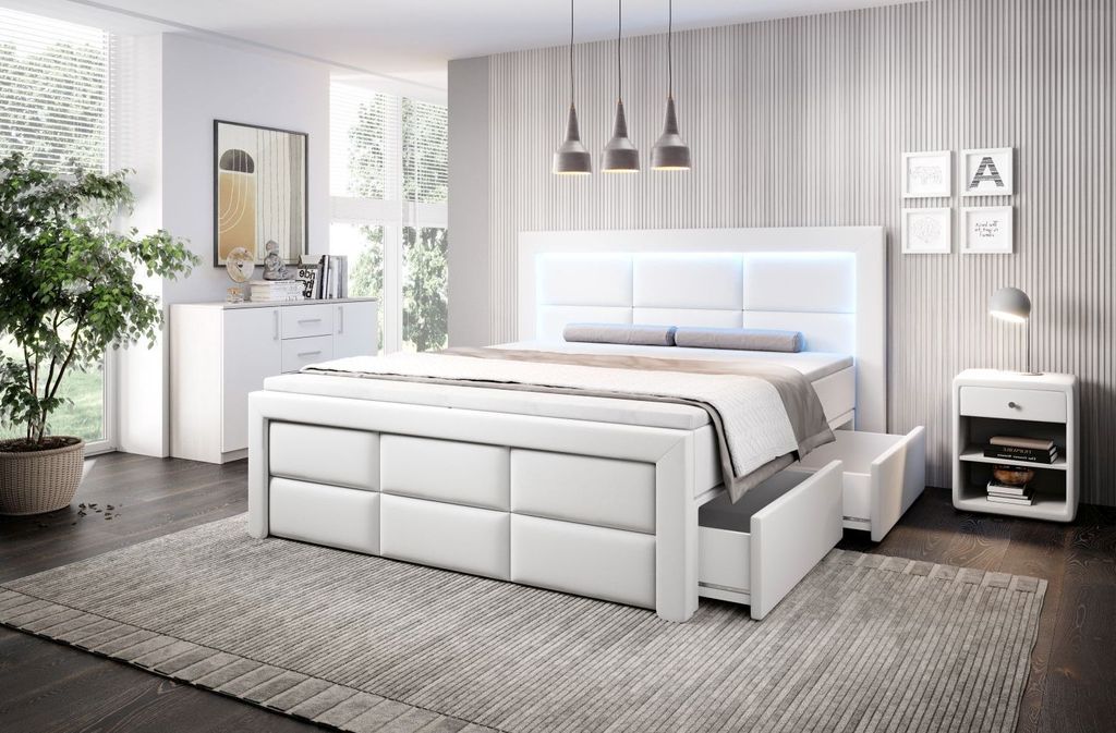 Boxspringbett Aston Bett mit Bettkasten rechts und LED 180x200 cm weiss