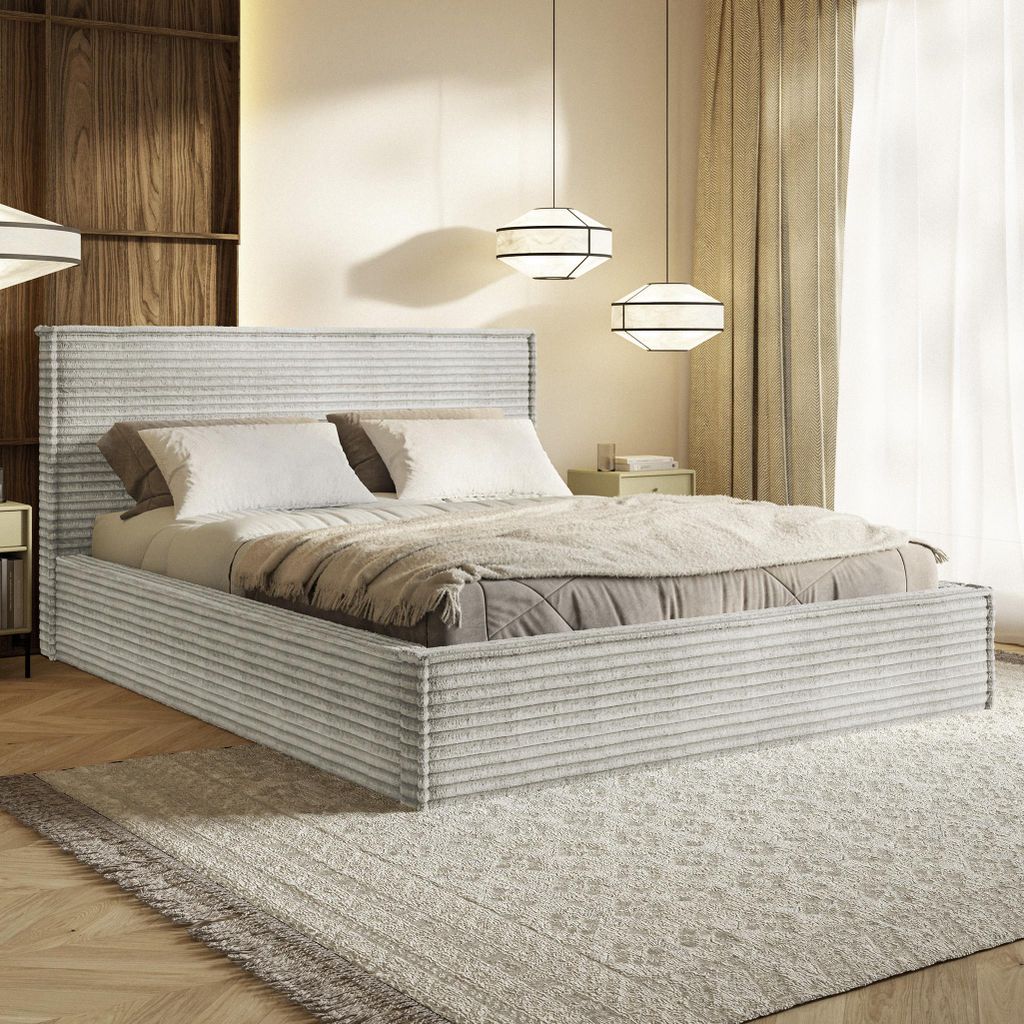 MOTIVENA Boho Polsterbett 180x200 mit Bettkasten, Holz Latttenrost, Bett 180x200 Grau Cord (Tilia 83)