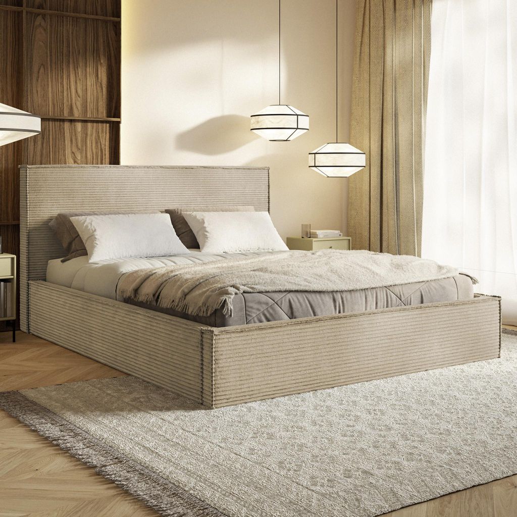 MOTIVENA Boho Polsterbett 180x200 mit Bettkasten, Metall Latttenrost, Bett 180x200 Beige Cord (Poso 02)