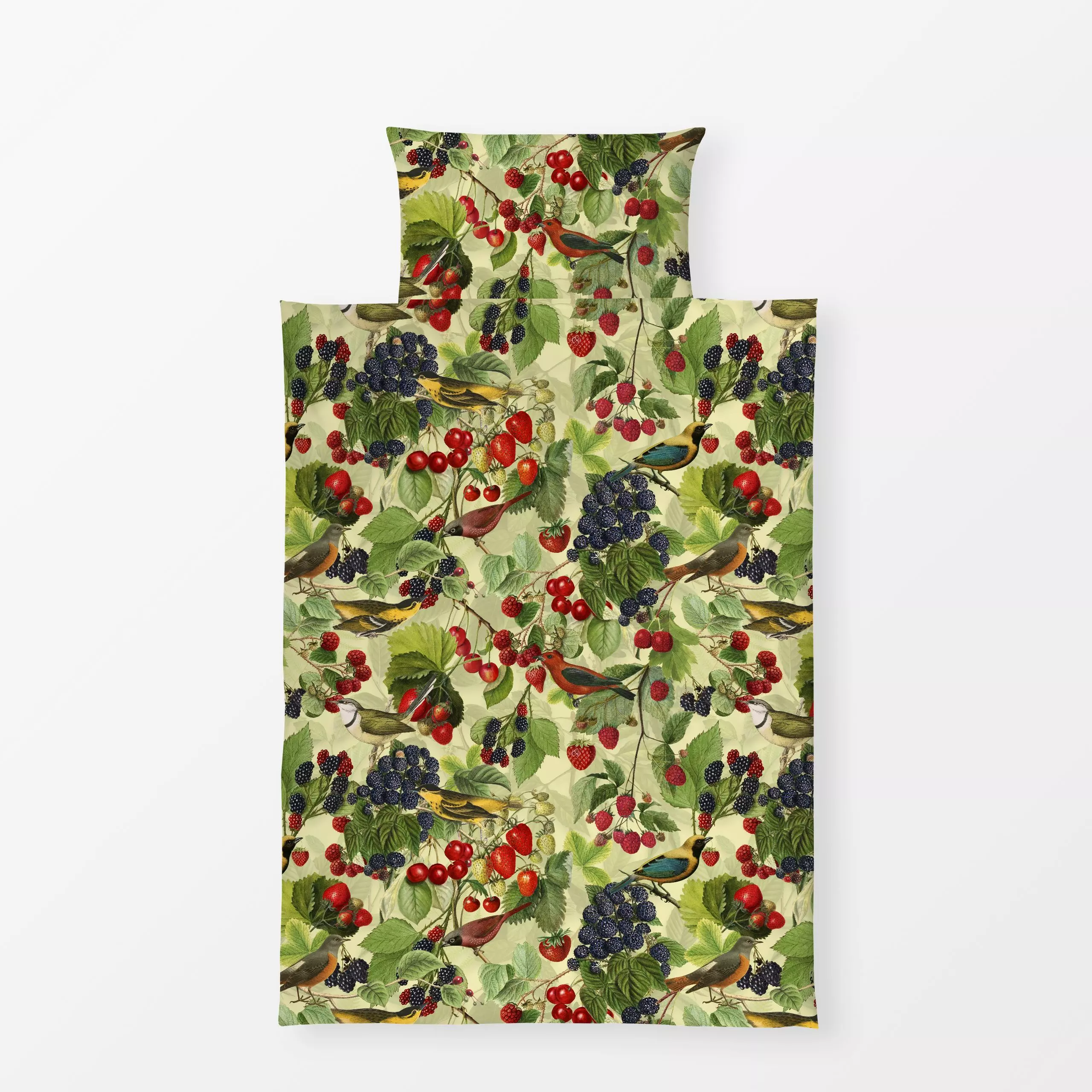 Bettwäsche Im Sommergarten hellgrün - Tiere, Pflanzen & Botanik - von „Andrea Haase"; Obst, Natur, Beeren, Vogel, vintage, b...