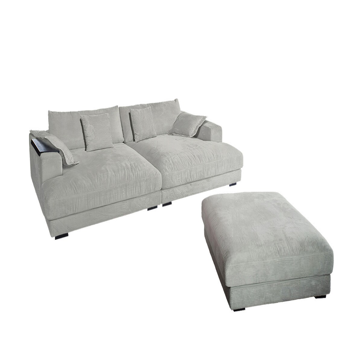 KAWOLA Big Sofa MADELINE Cord hellgrau mit Hocker / 4 Zierkissen / Armlehntablett schwarz