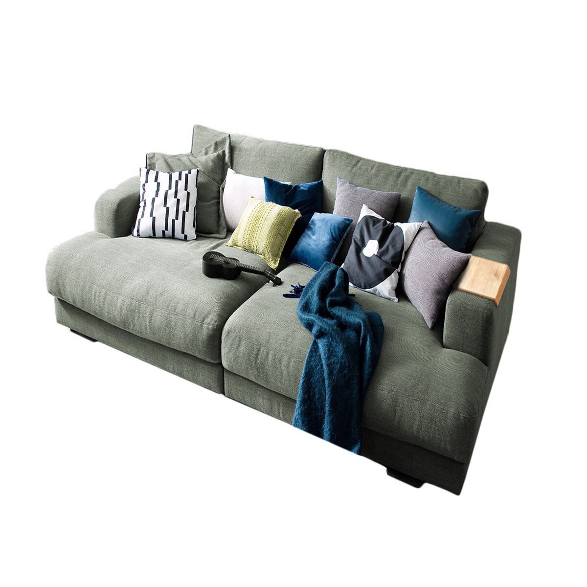 KAWOLA Big Sofa XL MADELINE mit Holztablett natur für Armlehne Stoff olivgrün