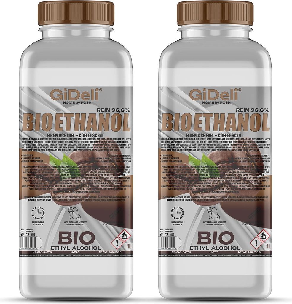 Bioethanol Kaffeeduft 96,6% 2L für Kamin Universal Rauchfrei und Rußfrei GiDeli