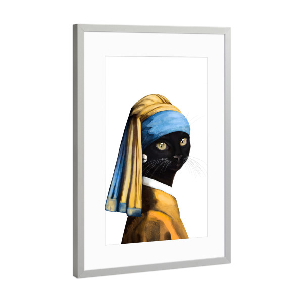 Poster mit Rahmen Silber "Black cat with a pearl earring" artboxONE - Für Kinder,Tiere,Fashion,Für Mama,Lustig