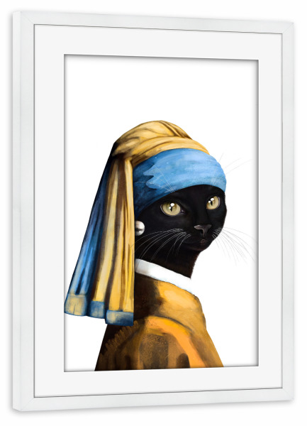 Poster mit Rahmen weiß "Black cat with a pearl earring" artboxONE - Für Kinder,Tiere,Fashion,Für Mama,Lustig