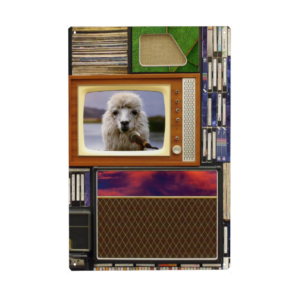 Metall Poster "Alpaka im TV" artboxONE - Tiere - Alpaka,Lama,Retro,Nostalgie,Tier,Surreal,Surrealism,Galaxy,Collage,Fantasie - Blechschild