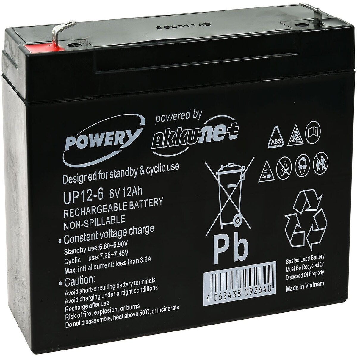 Bleiakku kompatibel UB6120 UB6130 6V 12Ah AGM Blei 10Ah