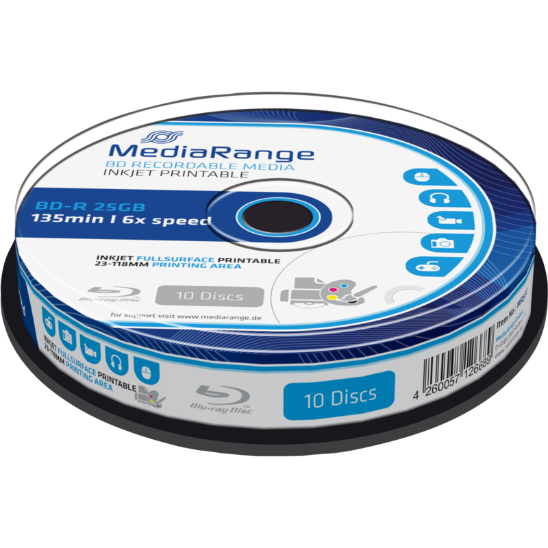 MediaRange BD-R 25GB Blu-ray-Rohlinge, 6fach, 10 Stück, bedruckbar