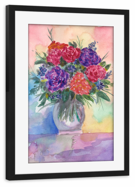 Poster mit Rahmen schwarz "Rote und Lila Rosen" artboxONE - Floral - Rosen,Blumen,Pflanzen,Bouquet,Strauß,Blumenstrauß,Wasserfarben,Blüten,Vase,Tisch