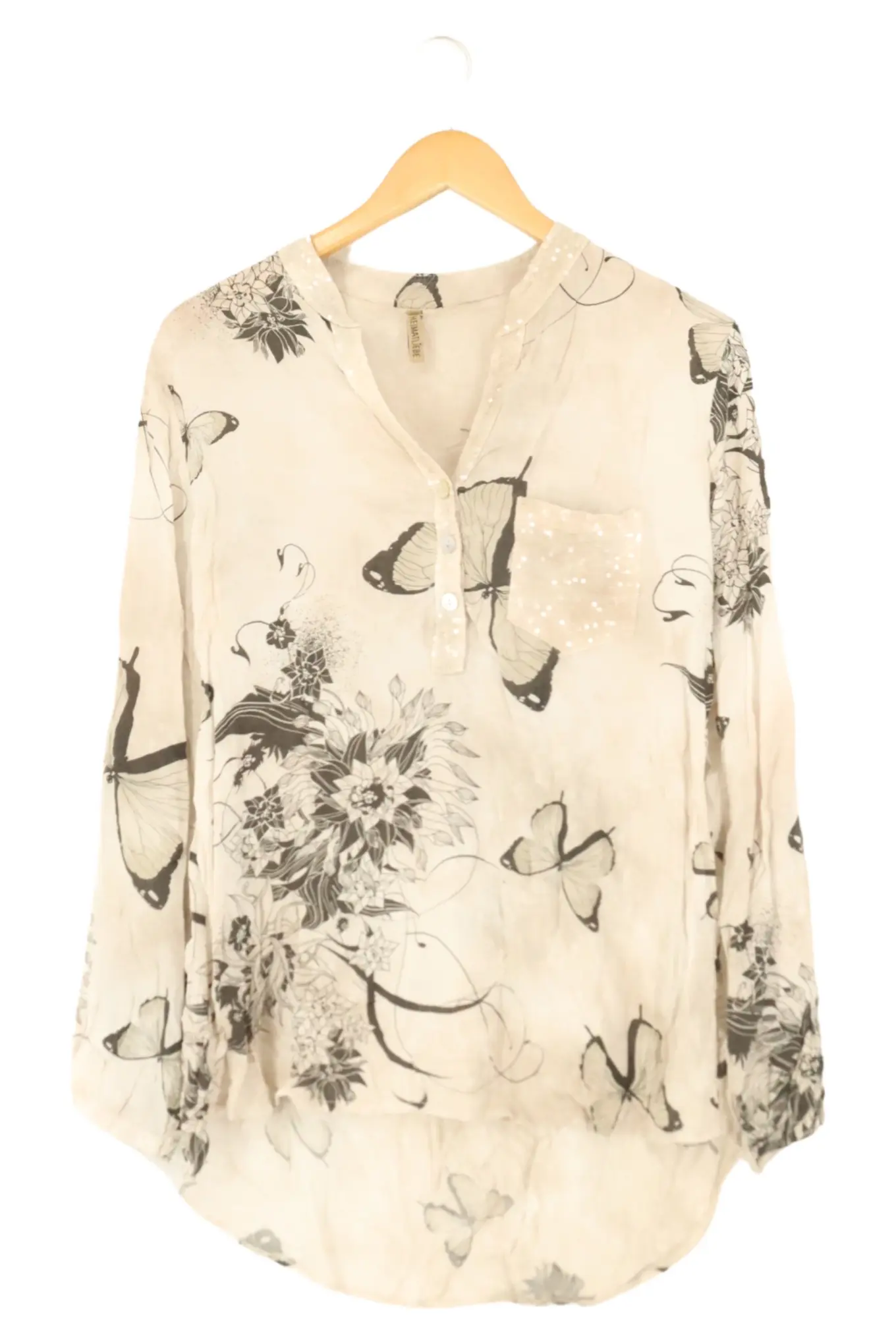HEIMATLIEBE Damen Bluse Gr. 38/M Beige Blumen Schmetterlinge Pailletten Elegant