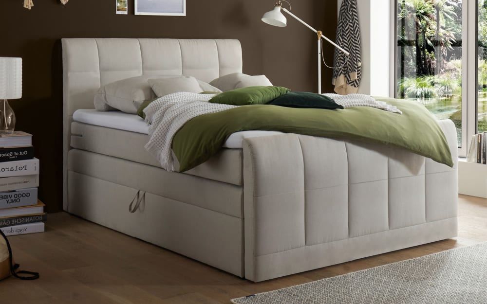 Polsterbett MAVILO - Komfortbett mit Stauraum, Doppelbett, 180x200cm, Beige, Bonellfederkernmatratze, H2/H3
