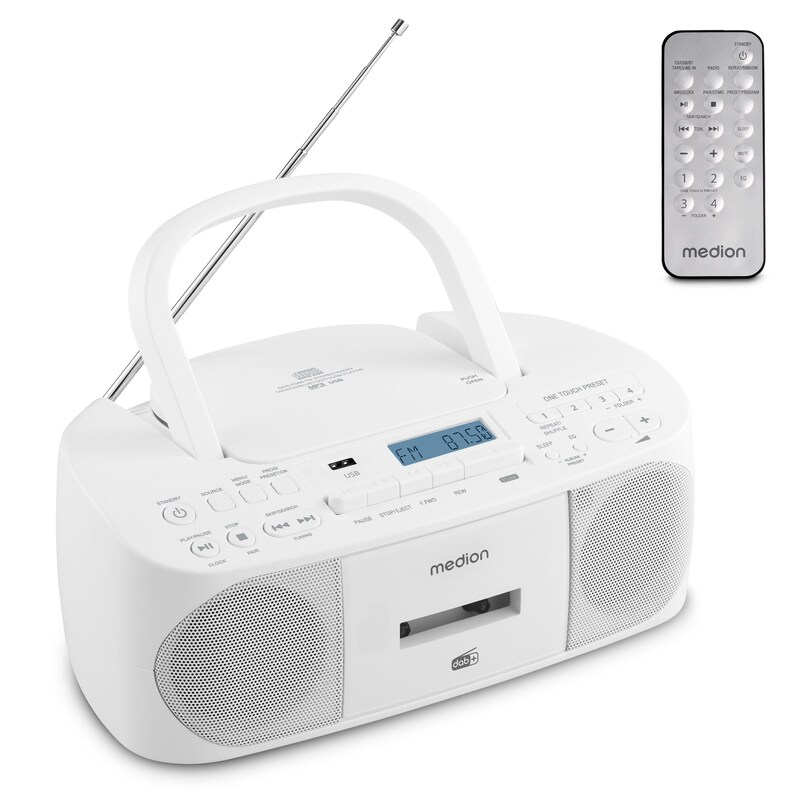 MEDION DRX-1 Plus Boombox weiß, DAB+/PLL-UKW-Stereo Radio, Bluetooth 5.4, CD-Kassetten-Radio mit MP3-Wiedergabe, USB Anschluss, CD-R/RW kompatibel,