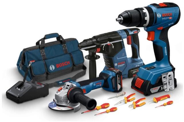 Bosch 18V Profi-Set, Schlagbohrschrauber, Winkelschleifer, Bohrhammer, Schraubendreher, Akkus, blau (0615A5007H)