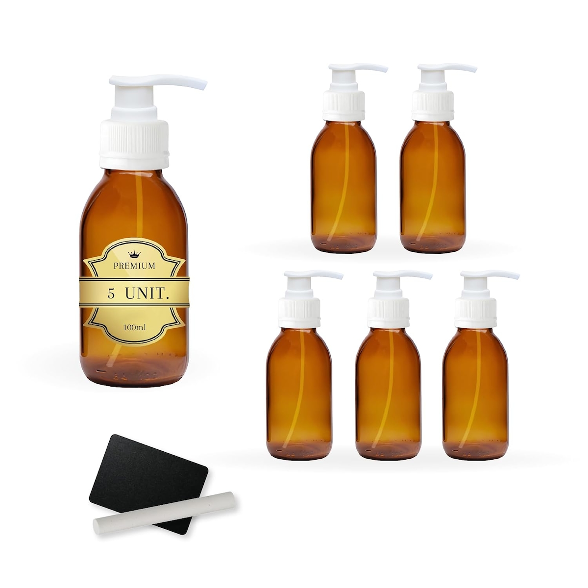Espírito rebelde 5x Botella con Bomba Dosificadora de Vidrio Ámbar de 100 ml con Tapón de Bomba + 5 Pizarras y Tiza – Aceites Esenciales y Cosméticos