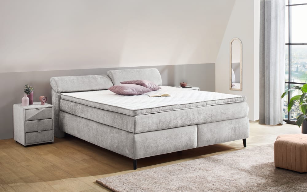 Boxspringbett TOM-OM 180 x 200 cm mit gepolstertem Kopfteil. Farbe: Hellgrau