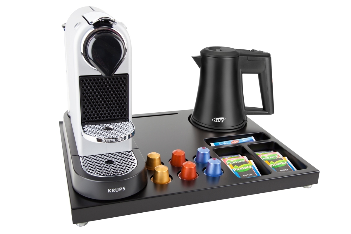 B-TRAY Willkommenstablett SUPREME Schwarz-Braun mit STAR Wasserkocher 0,5 L Schwarz OHNE Nespressomaschine