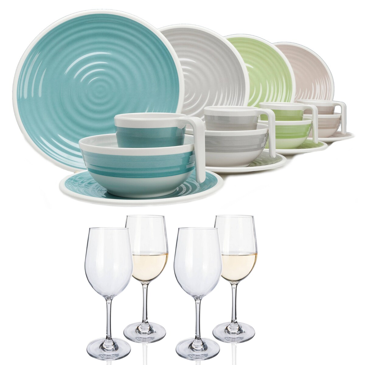 Moritz Harmonie Camping Geschirr Set 4 Personen + 4 Weißweingläser