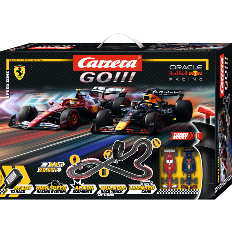 Carrera GO!!! Autorennbahn Set Champions Racing | F1 Racing mit Red Bull RB21 M. Verstappen No.1 und Ferrari SF-25 L. Hamilton No.44 | mit Turbo-Kn...