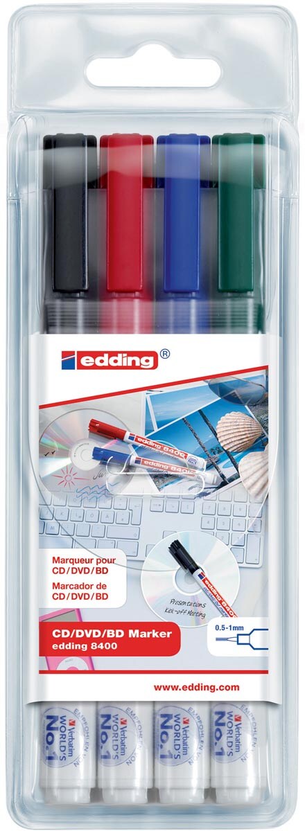 edding 8400 4 x CD-DVD-BD Marker Farben Schwarz Rot Blau Grün Set