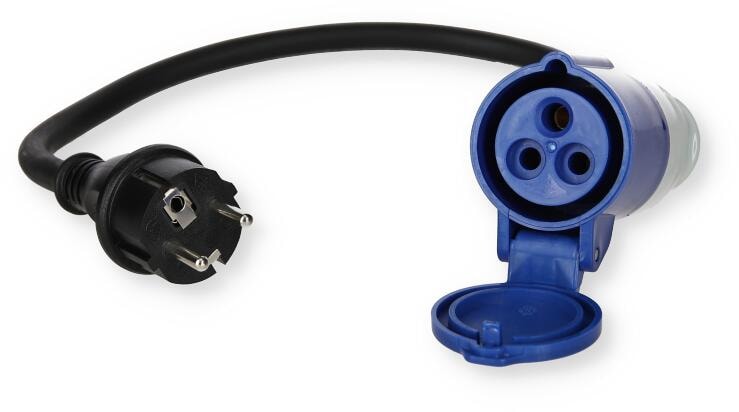Adapterleitung 1,5 m H07RN-F 3G2,5 Kabel CEE blau 16A 230V Winkelkupplung Schuko-Stecker 3 polig Stromadapter Adapter Caravan Campingadapter VDE Sc...