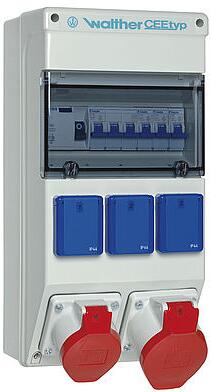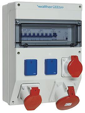 Walther Werke (6824403) Kunststoff-Steckdosenkombination in: 63A mit einem RCD TypA, 4 MCBs TypC, 3 CEE-Abgänge 16-63A, 2 Schukos und Klemmsatz K25 10