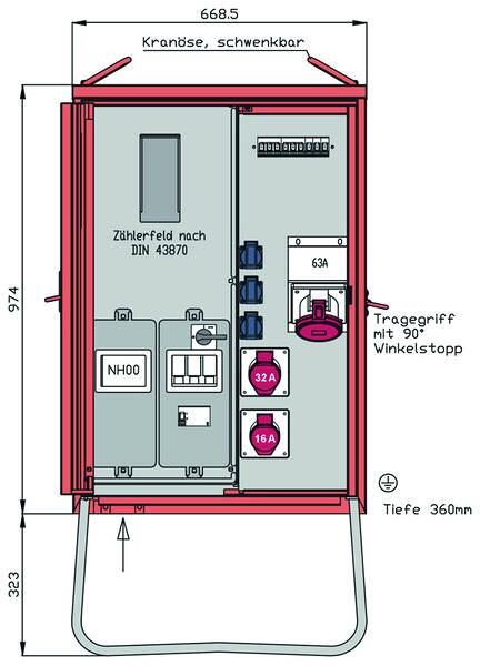 Walther Werke WAV0160R1 Anschlussverteilerschrank 44kVA, Zählerplatz, 3 CEE-Abgänge, 16-32A, 3x Schuko