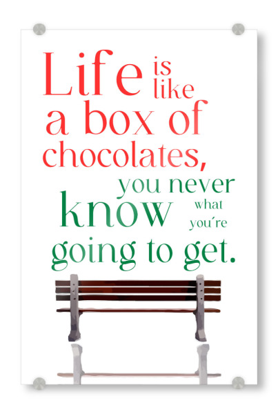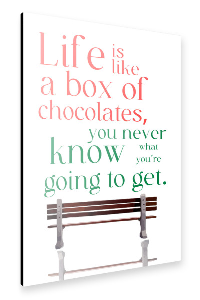 Acrylglasbild "Box of chocolates" artboxONE - Typografie - Quote,Metaphor,Unpredictability,Life,Chocolates,Bench,Red,Green,Text,White background