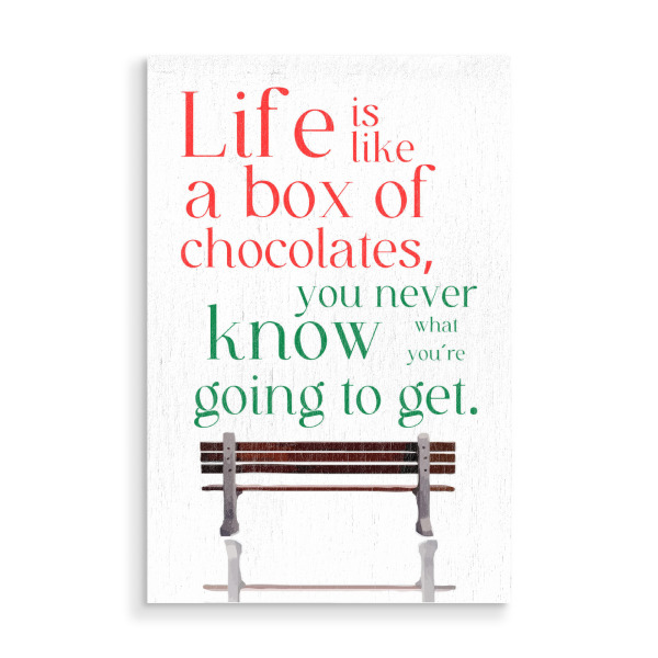 Holzbild "Box of chocolates" artboxONE - Typografie - Quote,Metaphor,Unpredictability,Life,Chocolates,Bench,Red,Green,Text,White background