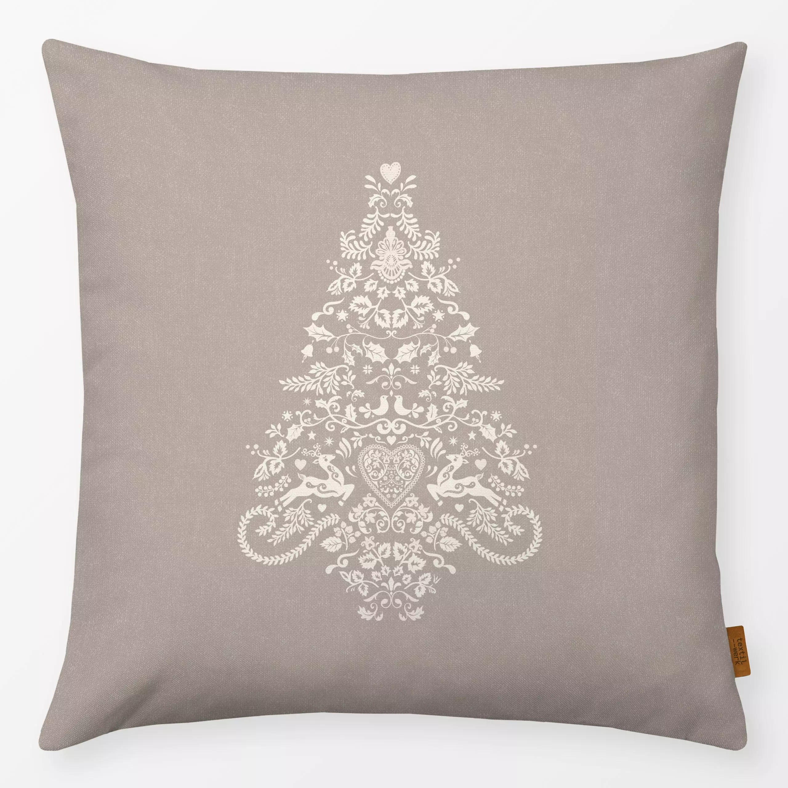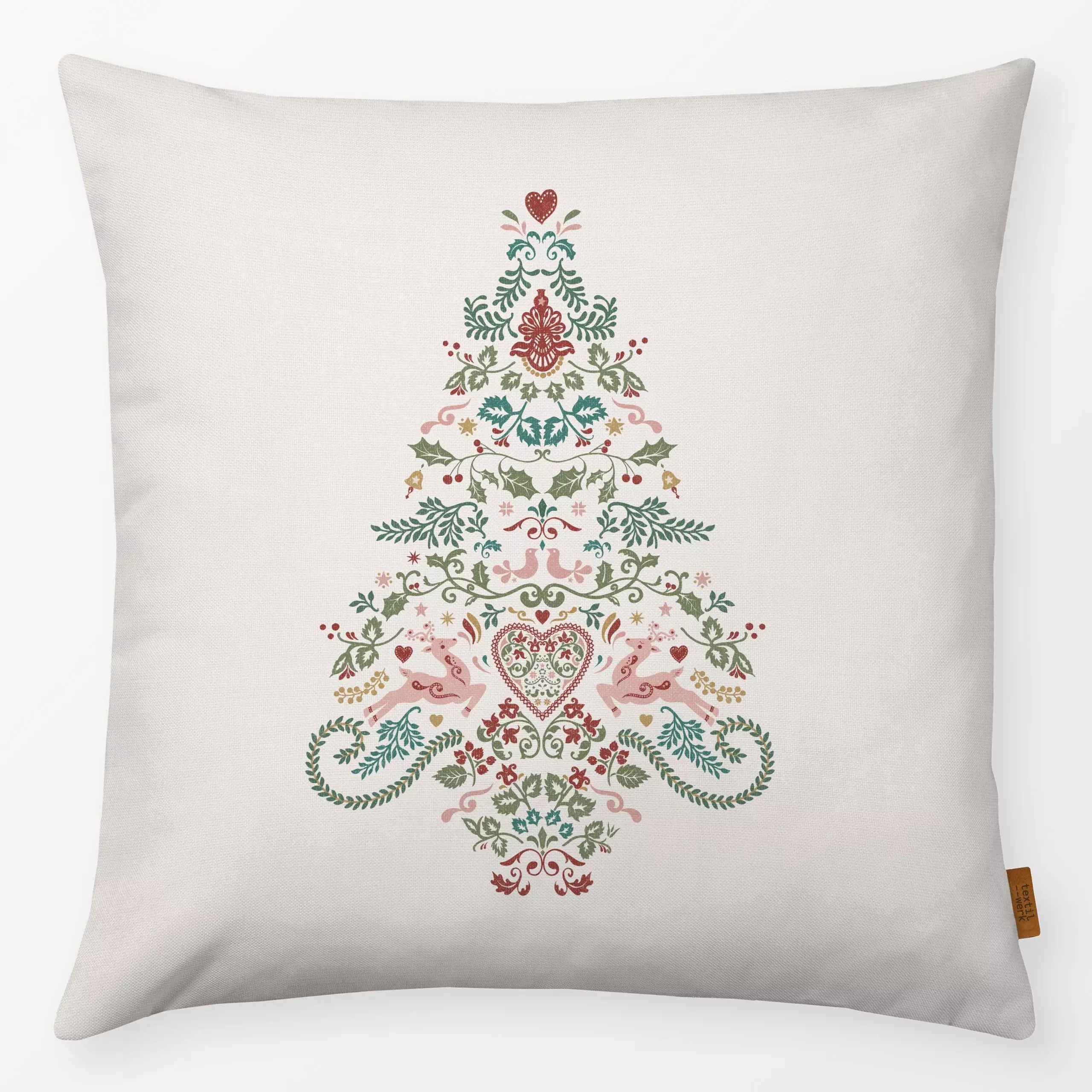Kissen Folk Christmas Tree - Beige - Tiere, Weihnachten, Winter - von „Bloomery Decor"; Merry Christmas, Rentier, Tannenbaum...