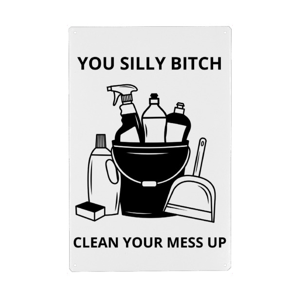 Metall Poster "Clean your mess up" artboxONE - Lustig - Humor,Cleaning,Bucket,Supplies,Monochrome,Text,Typography,Bottles,Spray,Illustration