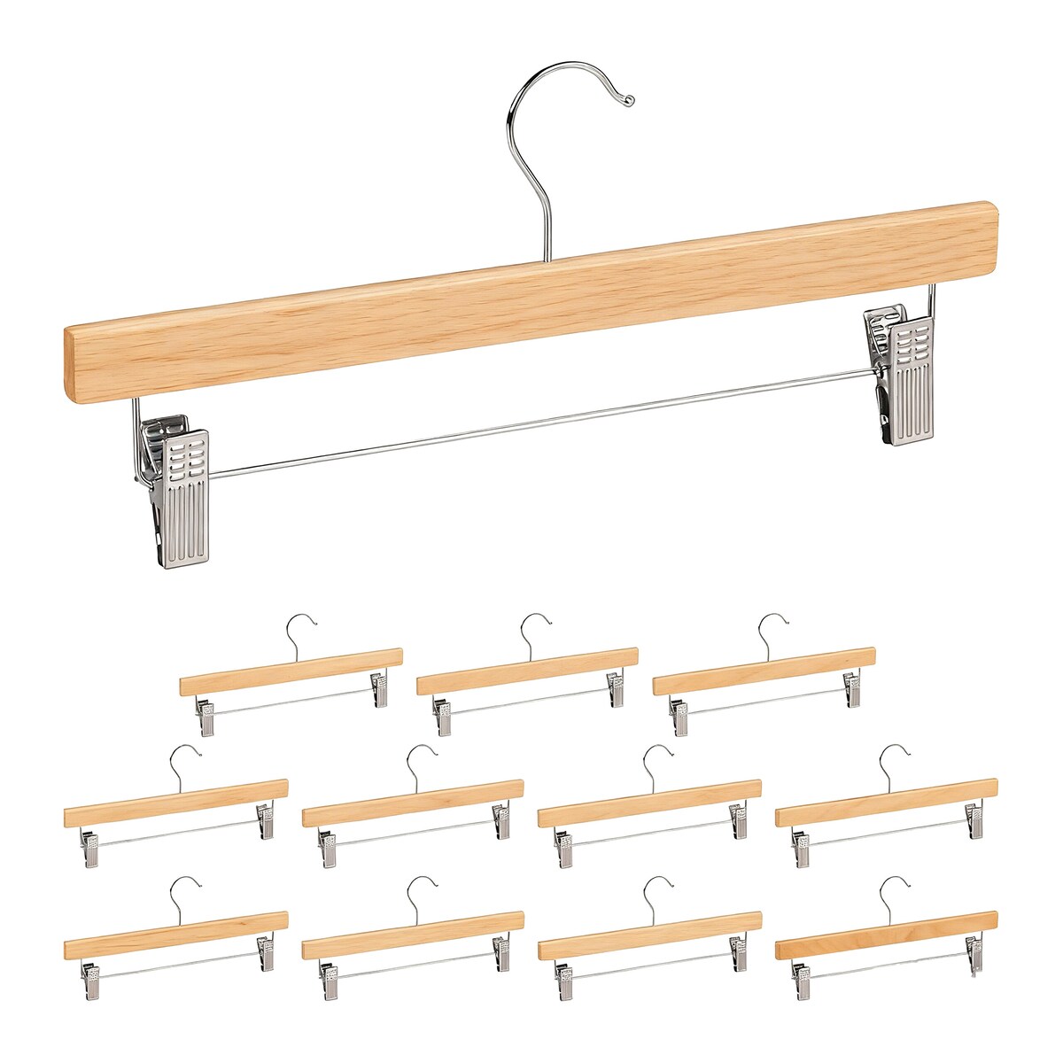 Relaxdays Hosenbügel Holz, 12 Stück, verstellbare, gummierte Clips, 360° drehbarer Haken, Rockbügel, 35,5cm breit, natur