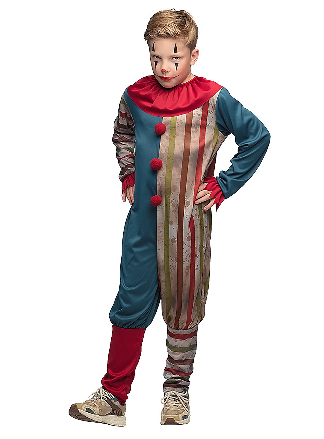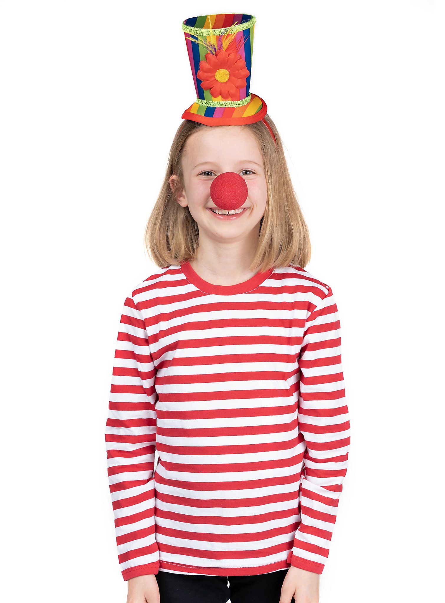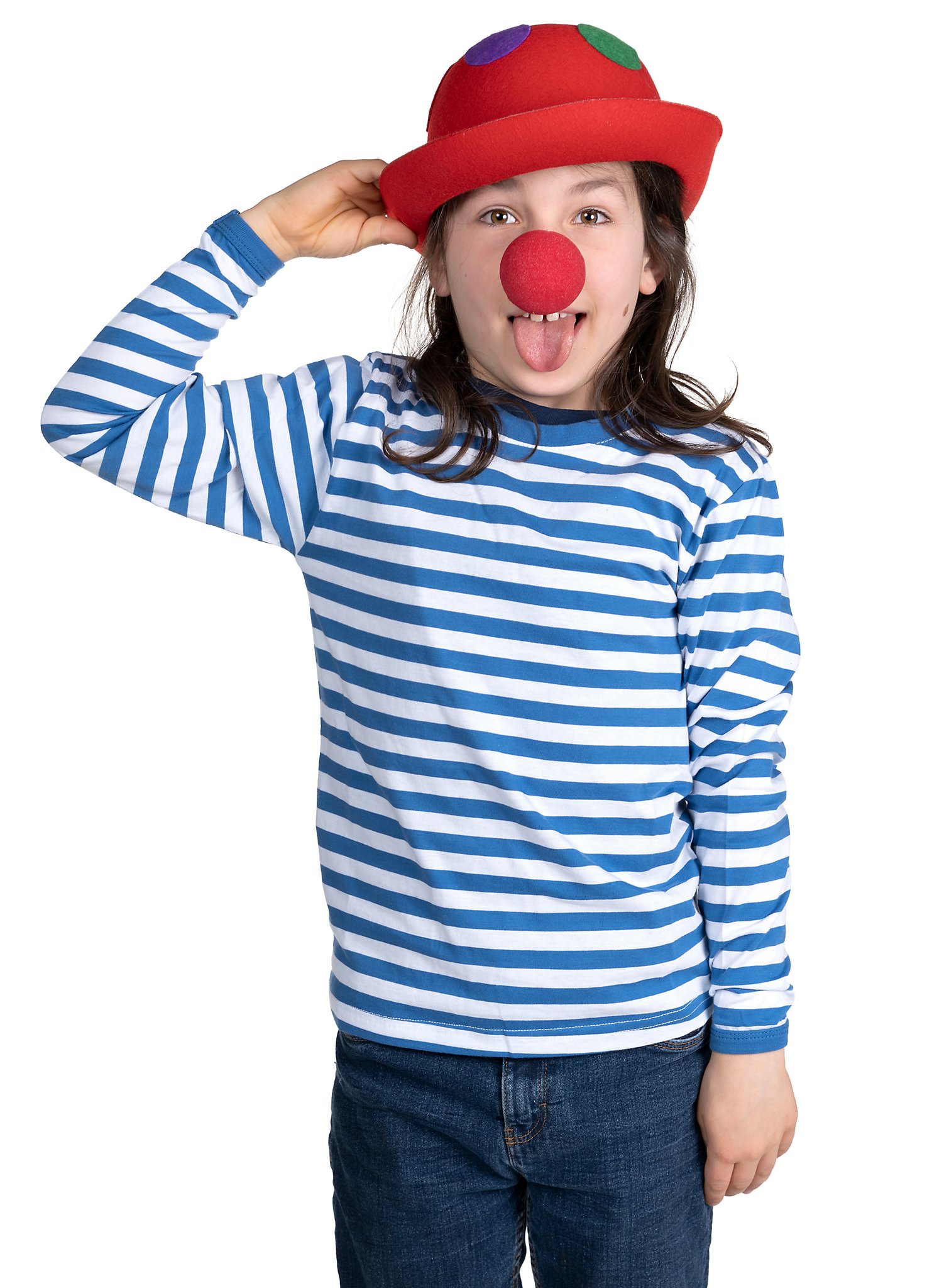 Costume da clown per bambino con camicia a righe blu, naso e cappello da clown