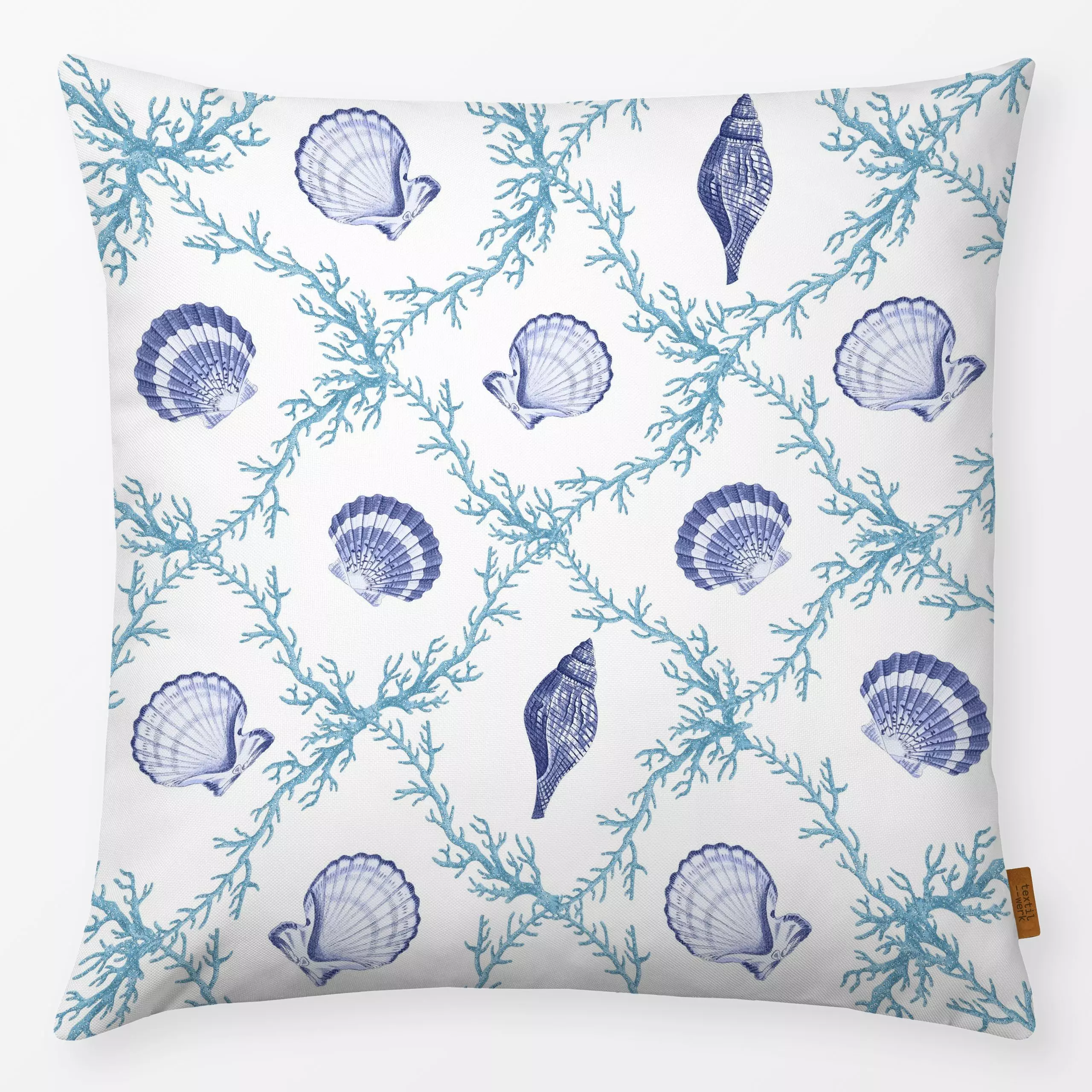 Kissen Preppy coastal shells I - Sommer, Tiere, Symbole & Muster - von „Bloomery Decor"; Muscheln, coastal, blue, fresh, cor...