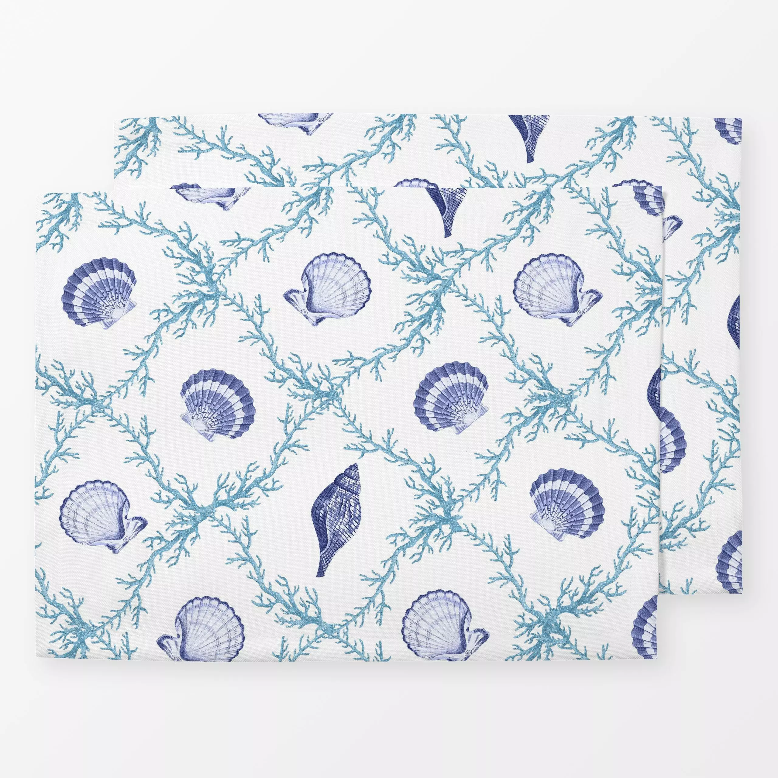 Tischset Preppy coastal shells I - Sommer, Tiere, Symbole & Muster - von „Bloomery Decor"; Muscheln, coastal, blue, fresh, c...