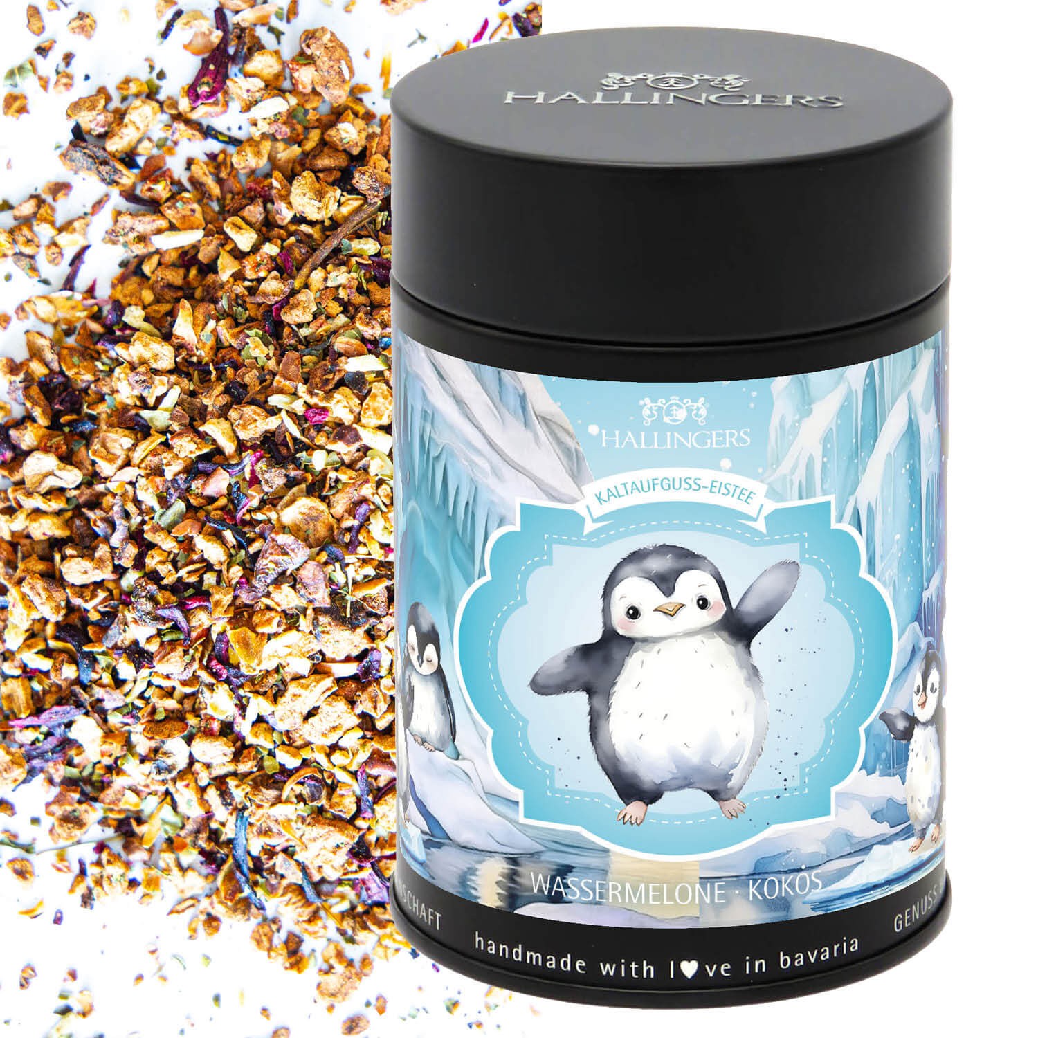 Tee Geschenk - Loser Cold Brew Früchtetee Eistee für Jungen & Mädchen kalt & warm aufgießbar Wassermelone-Kokos, edle Geschenkdose "Pinguin Eistee", G