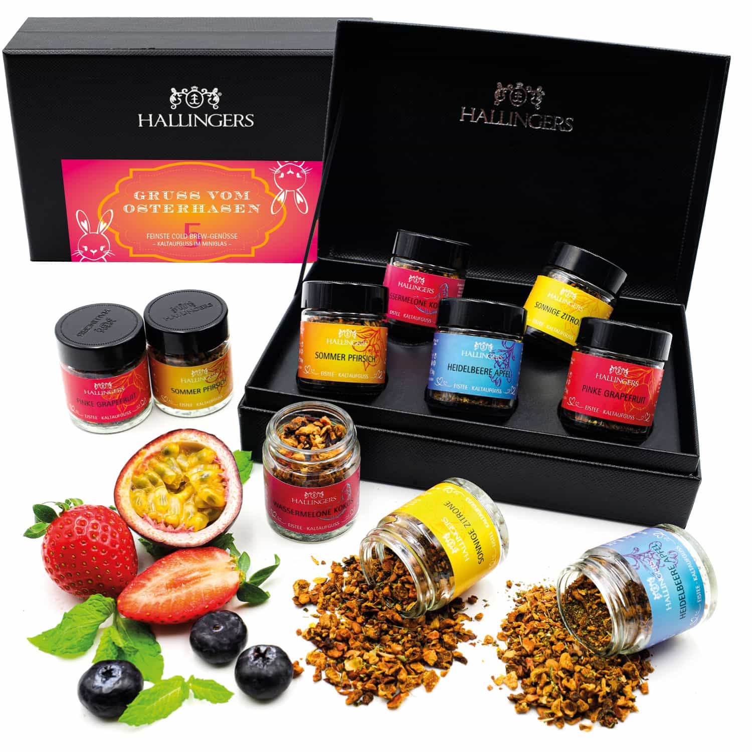 Tee Geschenkset Ostern – 5 Sorten Premium loser Cold Brew Tee im Glas in edler Geschenkbox, veganes Tee Set "Gruß vom Osterhasen" Probierset, Geschenk