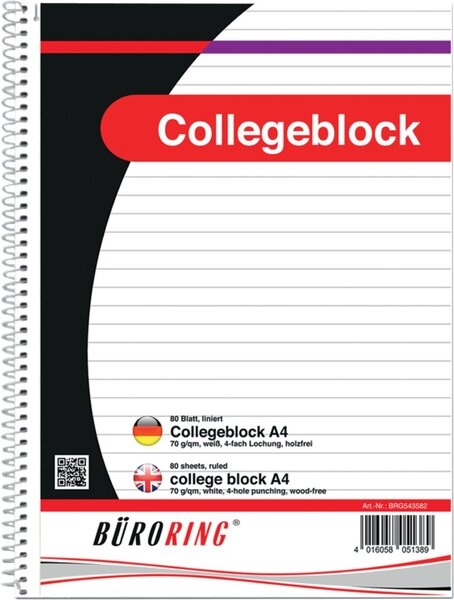 Büroring Collegeblock A4/80 Blatt, liniert, holzfrei, weiß, 70g/qm, Lineatur: 21, Mikroperforation, 4fach-Lochung