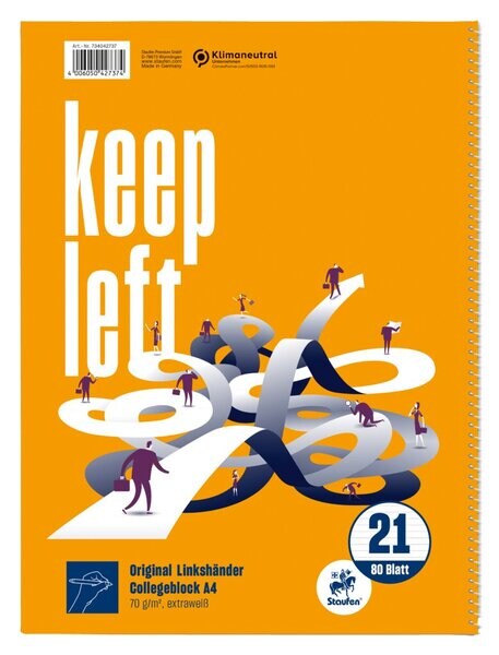 Collegeblock für Linkshänder, A4, Spiralbindung rechts, liniert, 80 Blatt, 70g/qm