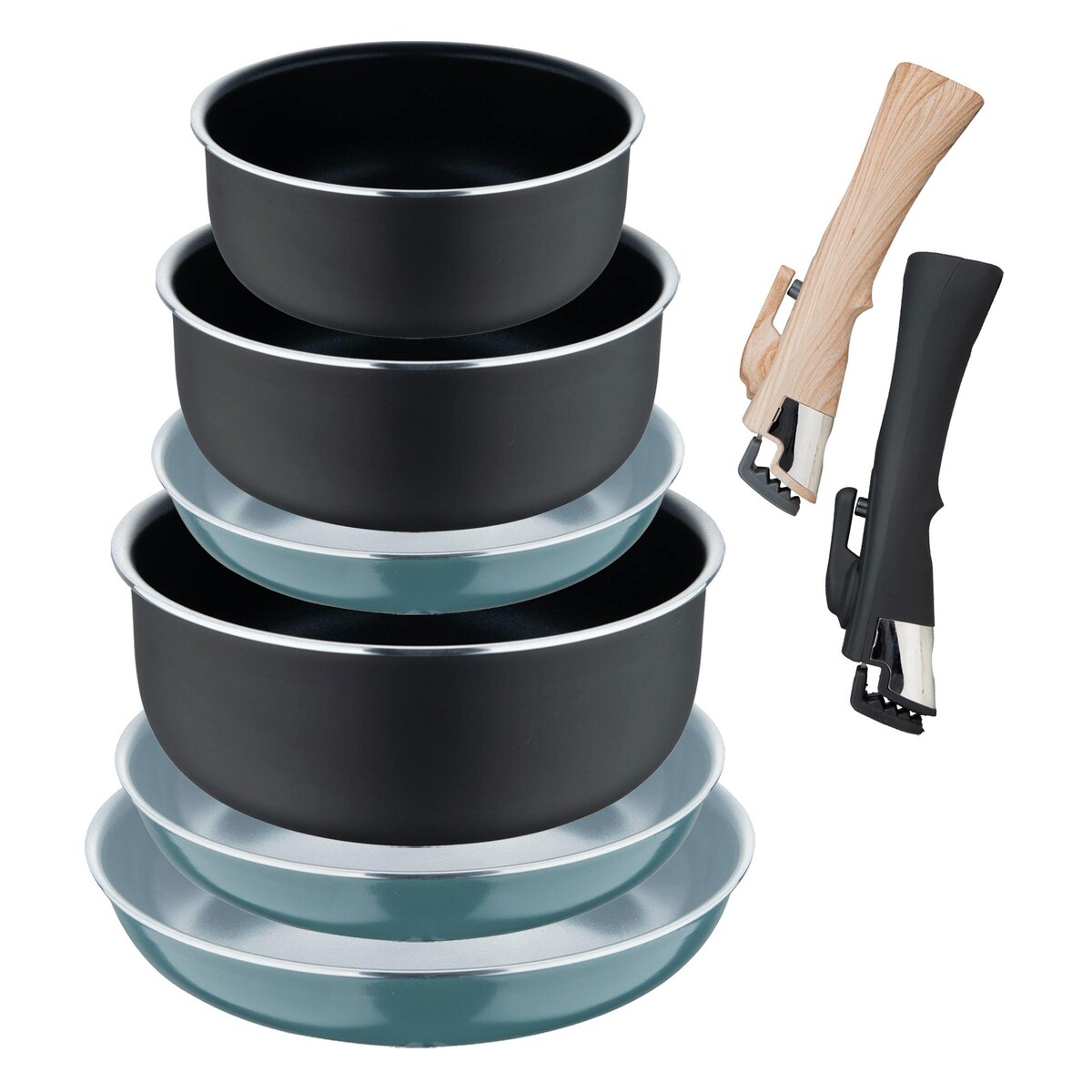 BERGNER Click&Cook - 10-teiliges schwarzes Kochgeschirr-Set mit abnehmbaren Griffen: 3 Bratpfannen, 2 Töpfe, Deckel und Küchenhelfer aus Aluminiumguss