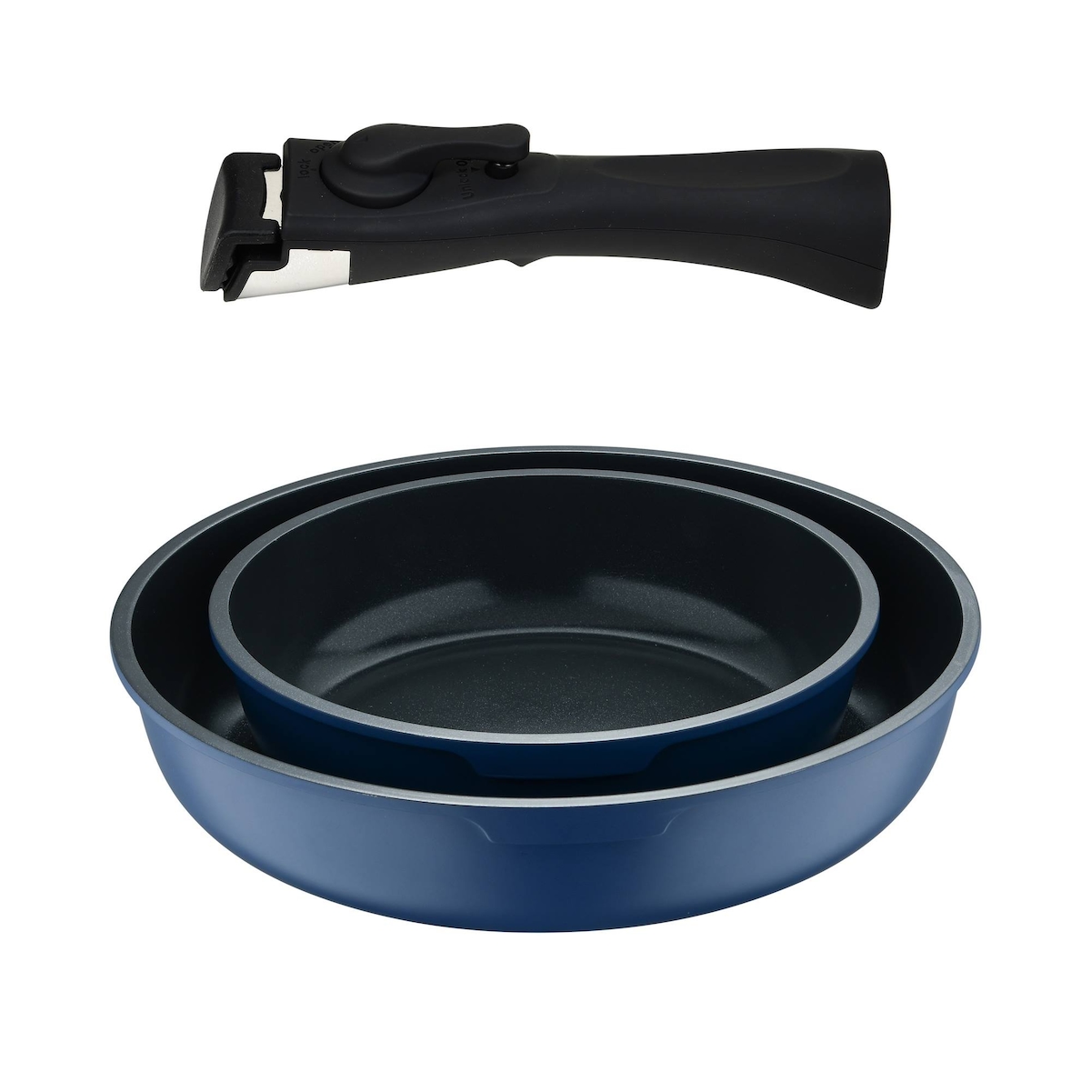 BERGNER Click&Cook - Set mit 2 Bratpfannen Ø22Ø26cm, Aluminiumguss, blau, mit abnehmbarem Griff