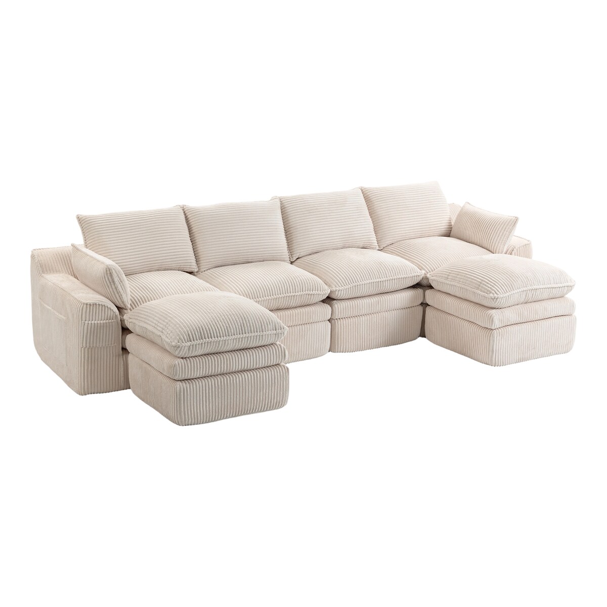 Merax Modulares 4-Sitzer Cordsofa, mit 2 Hocker, Kissen & Seitentaschen, 3‐lagiger Schaumstoff + Federkern, Beige