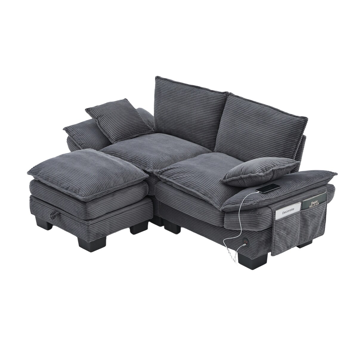 Merax 2-Sitzer-Sofa mit Hocker, USB-C-Anschluss & Seitentaschen, Dicke Kissen, Corduroy, Dunkelgrau