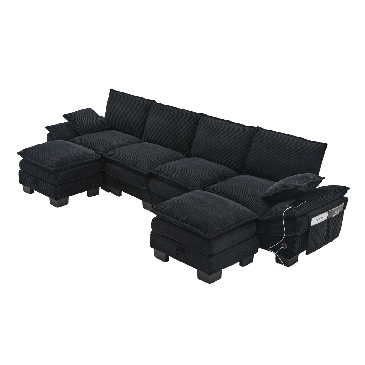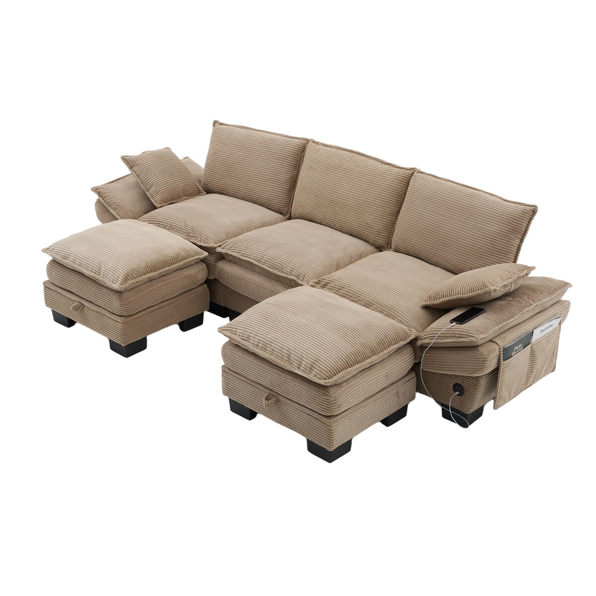 U-förmiges Sofa aus Corduroy, inklusive 2 Fußhockern mit Staufunktion, Couchtisch, 2 Getränkehaltern, 1 USB-Anschluss, 2 Steckdosen und 2 Type-C...