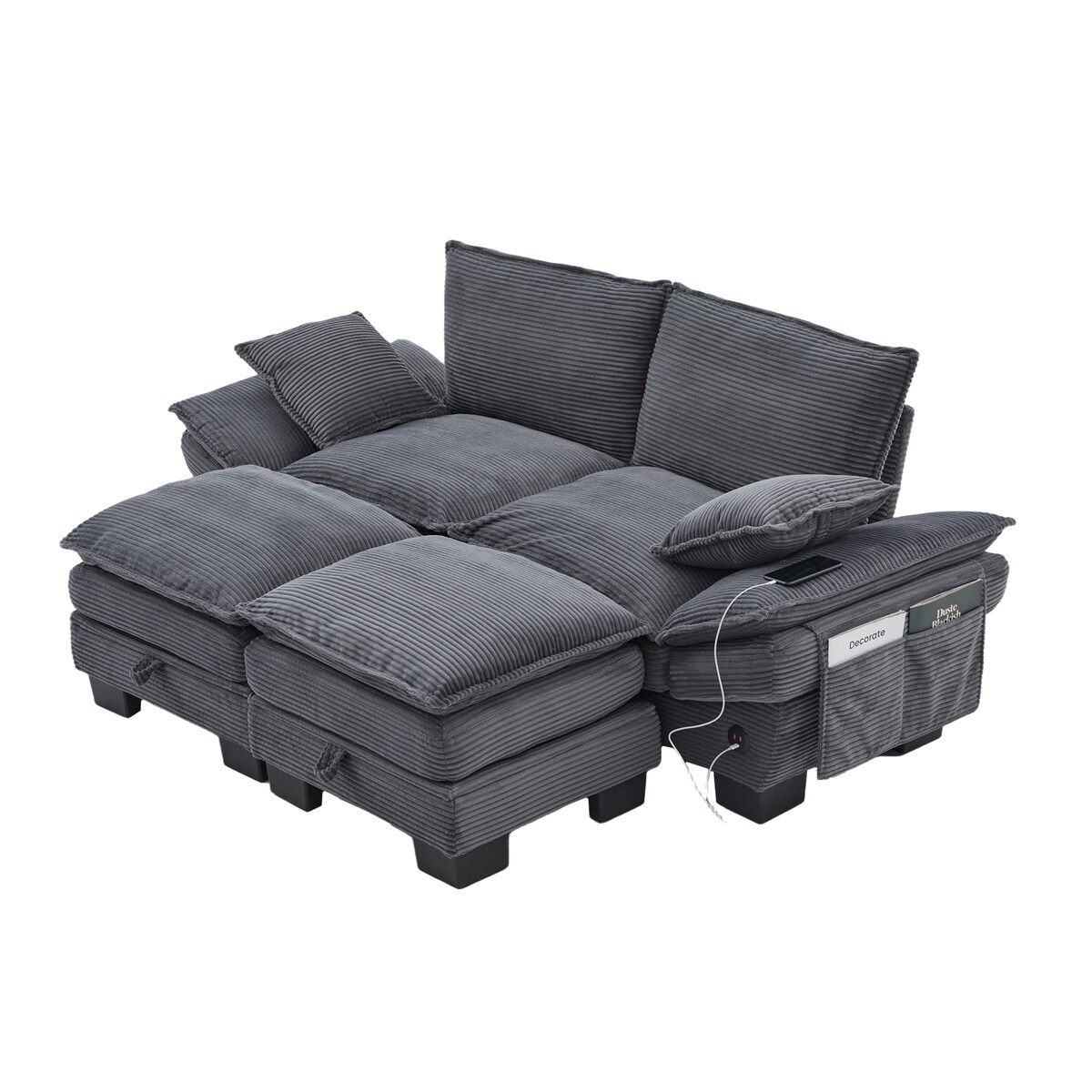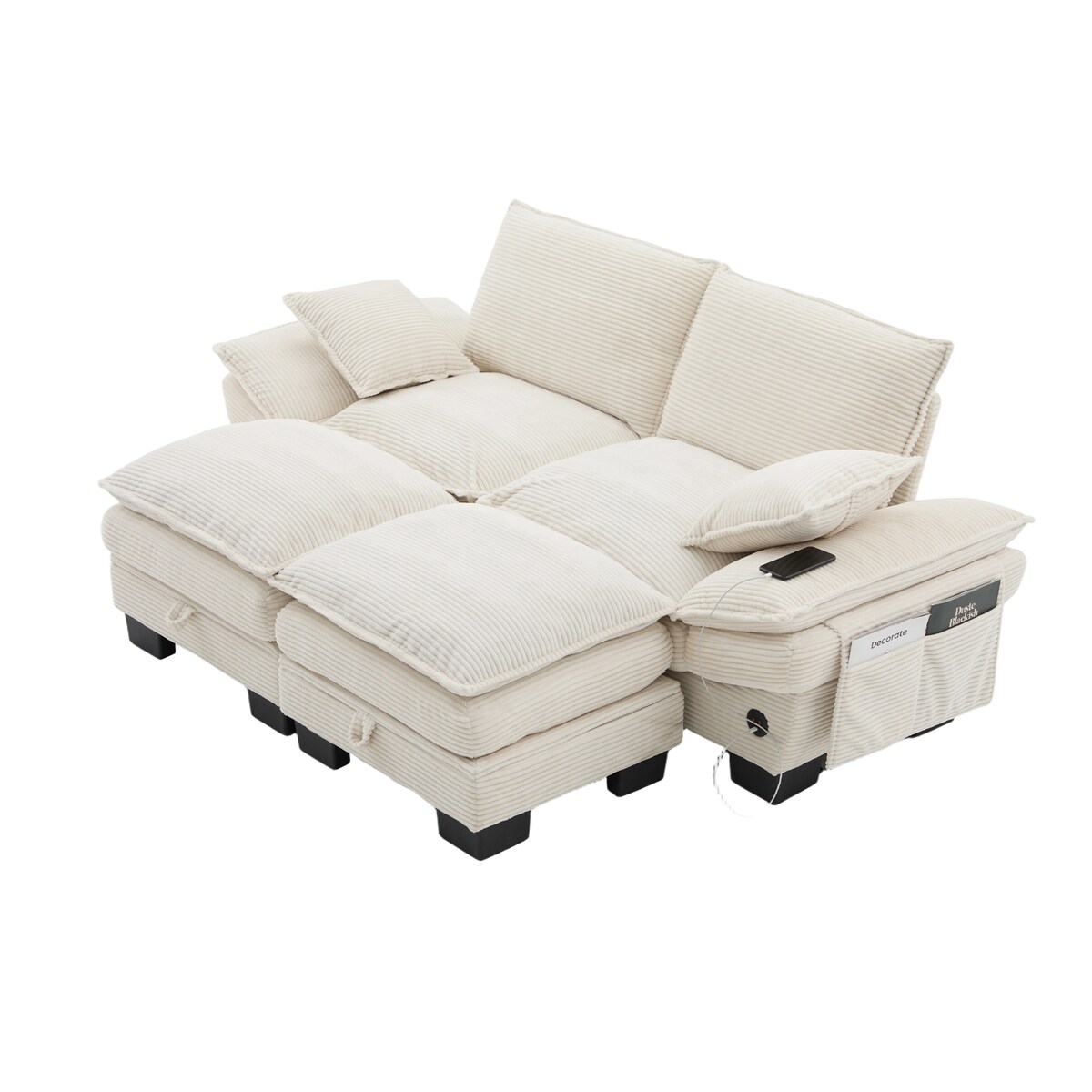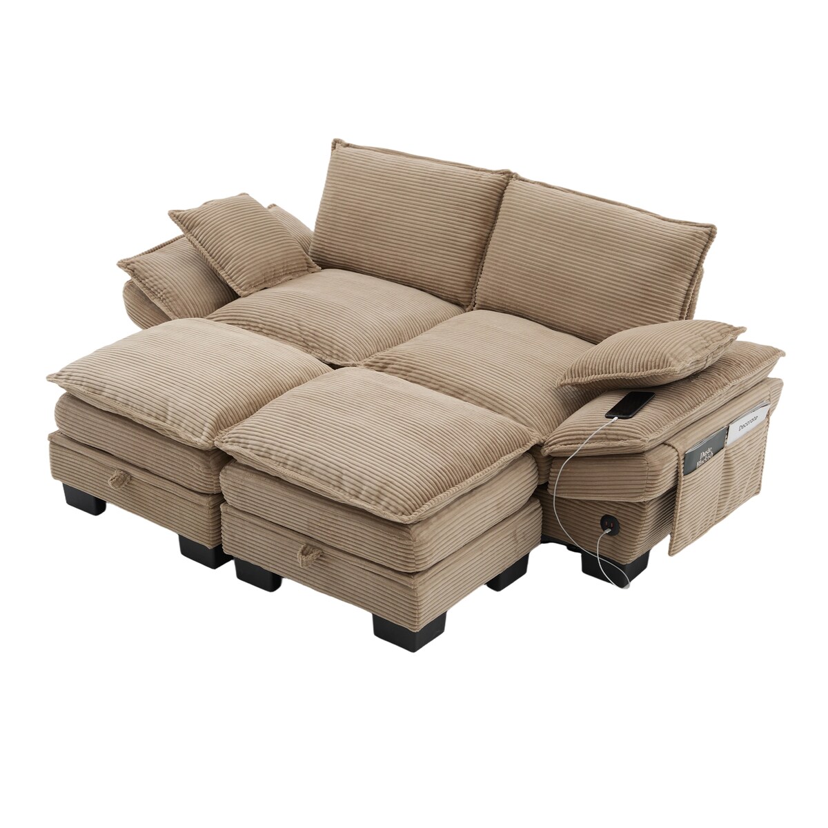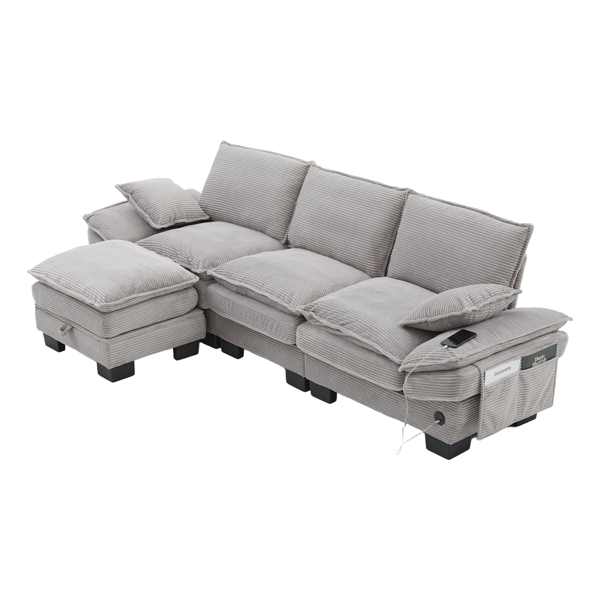 MODFU Viersitzer Sofa mit USB und C-Anschluss Loungesofa mit zwei Hocker breiter Sitzfläche Corduroy Modulares Sofa mit Seitentaschen für das Woh...