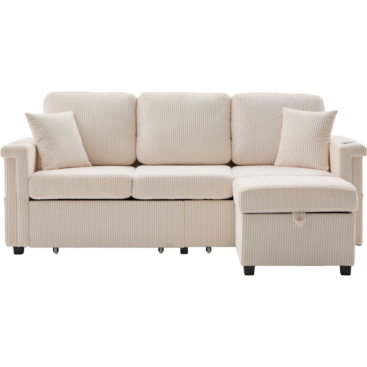 Corduroy-2-in-1-Schlafsofa,mit zwei Kissen, klassischen quadratischen Armlehnen, abnehmbarem Hocker, modulares Sofa mit flexibler Konfiguration,Beige