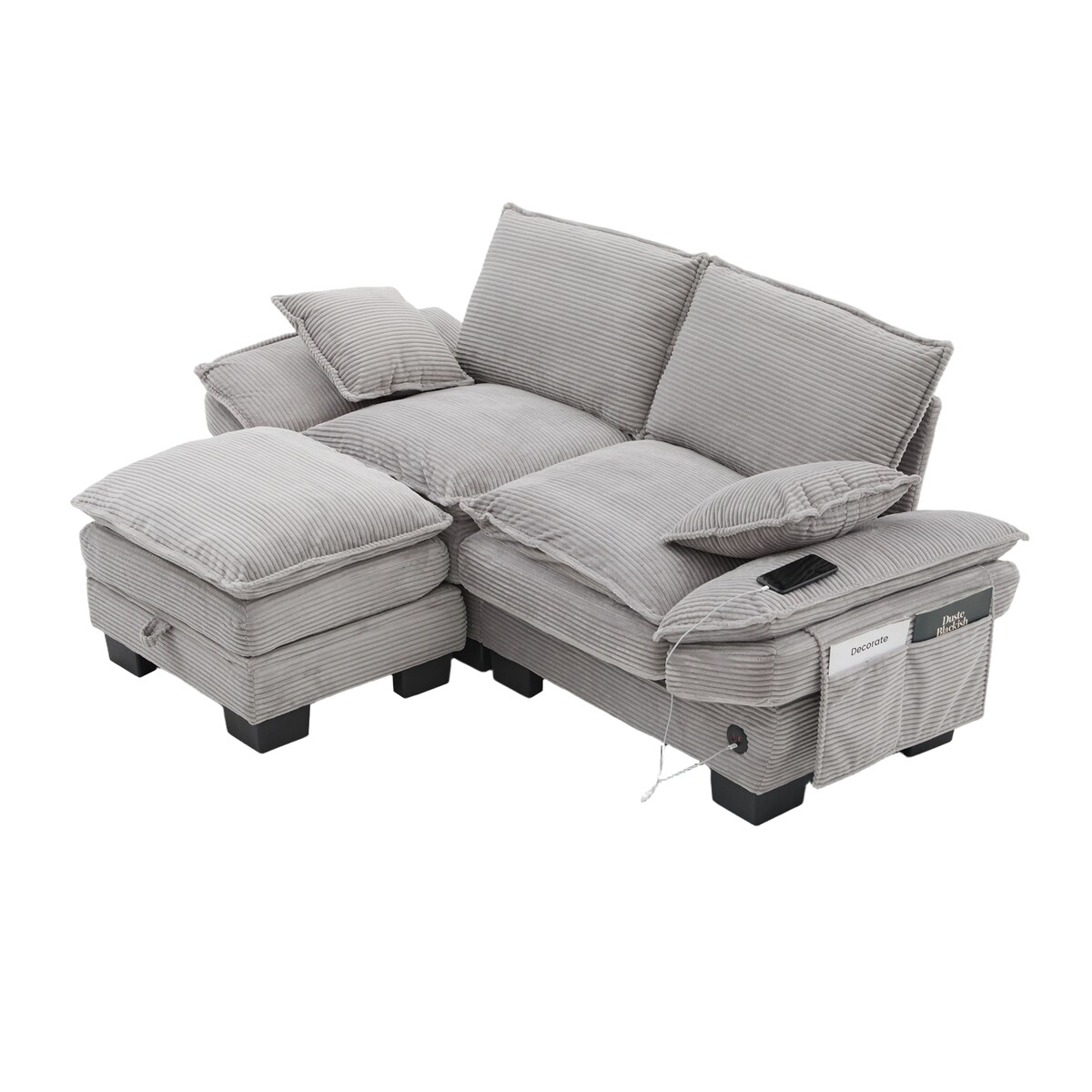 Merax 2-Sitzer-Sofa mit Hocker, USB-C-Anschluss & Seitentaschen, Dicke Kissen, Corduroy, Hellgrau